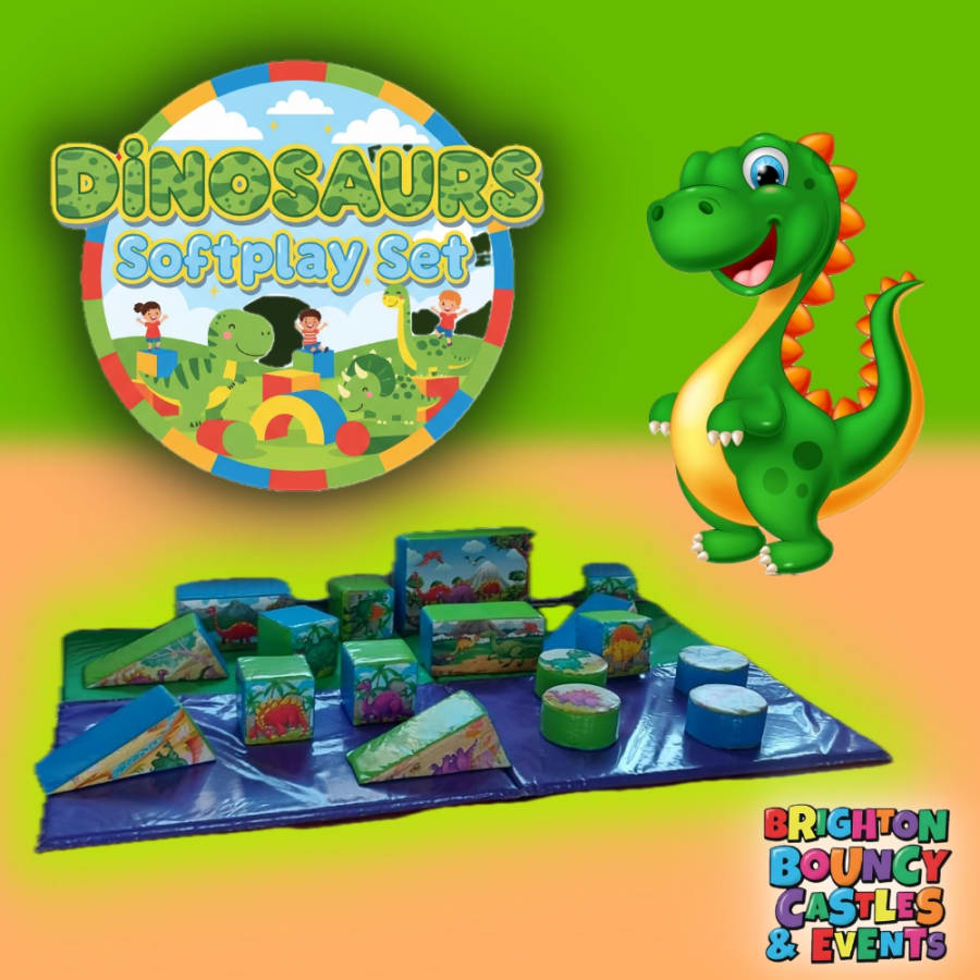 dinosaurs party hire Dinosaurs Softplay Set in brighton hove bouncy castle hire π¦π. Bright, vibrant and safe. This soft play set includes 17 dinosaur-shaped pieces in assorted colours to spark learning and imaginative play. Ideal for toddlers and young children at birthday parties, nurseries and family events. We supply safety matting with every set for peace of mind. π‘οΈ