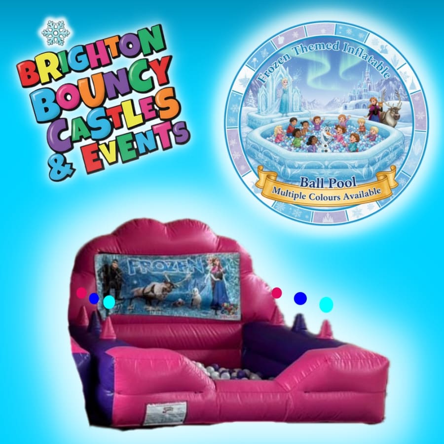 Delight your child with our Frozen Themed Inflatable Ball Pool. Ready for parties and playdates, this vibrant ball pool includes built-in air jugglers and 700 multi-coloured certified commercial soft play balls for safe, active fun. Ideal for toddlers and young children who love Frozen characters. party hire brighton and sussex Frozen Themed Inflatable Ball Pool in brighton hove sussex and surrounding