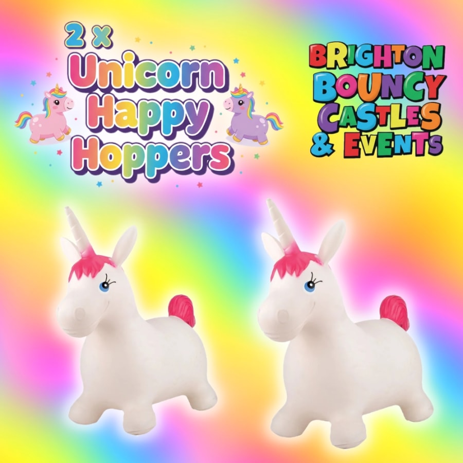 Add energy and smiles with our 2 x unicorn Happy Hoppers. Perfect for toddlers and small children, these hopper toys boost balance, coordination and giggles. Ideal as an add-on to soft play or bouncy castle hire. Book now for reliable event party hire in Brighton hove east Sussex bouncy castle hire Brighton . ๐ฆ๐