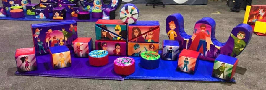 This package includes ten soft play shapes and safety matting, and a super hero bouncy castle and ball pool with soft play balls.
