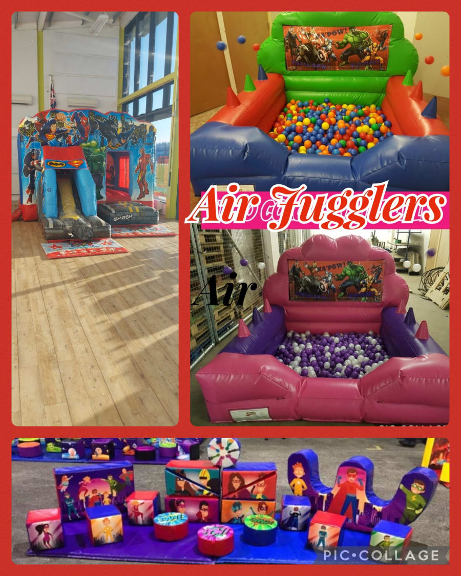 This package includes ten soft play shapes and safety matting, and a super hero bouncy castle combi and ball pool with soft play balls.